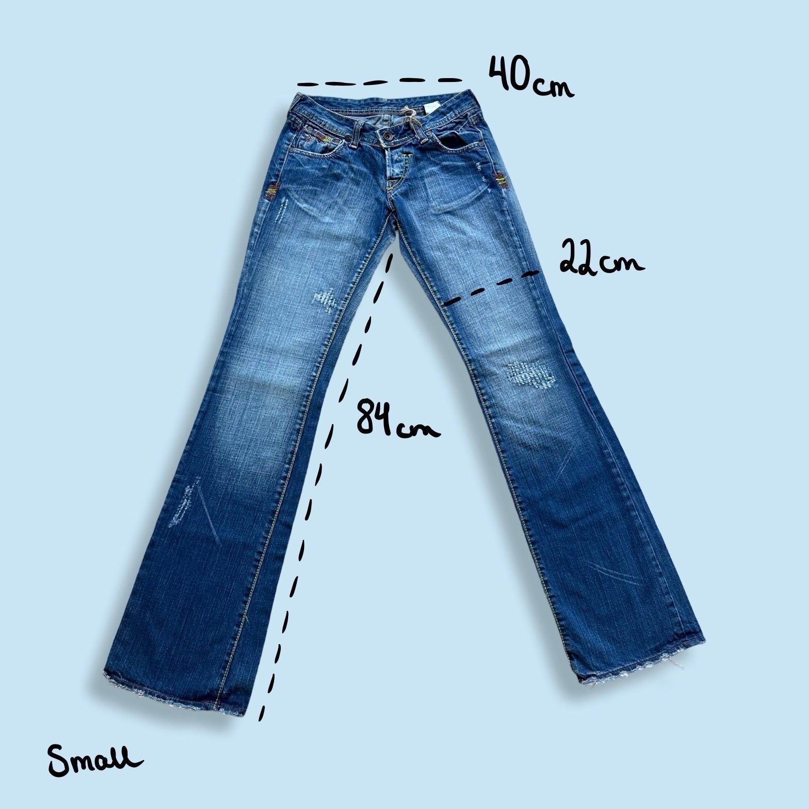Alle bukser har lik passform, lav i livet med sleng. Kan sees på modell på Instagram. Det er ingen stretch i denimen, så dersom du er usikker på størrelse vil jeg anbefale å gå en opp. Mål vises på bilde nummer tre.