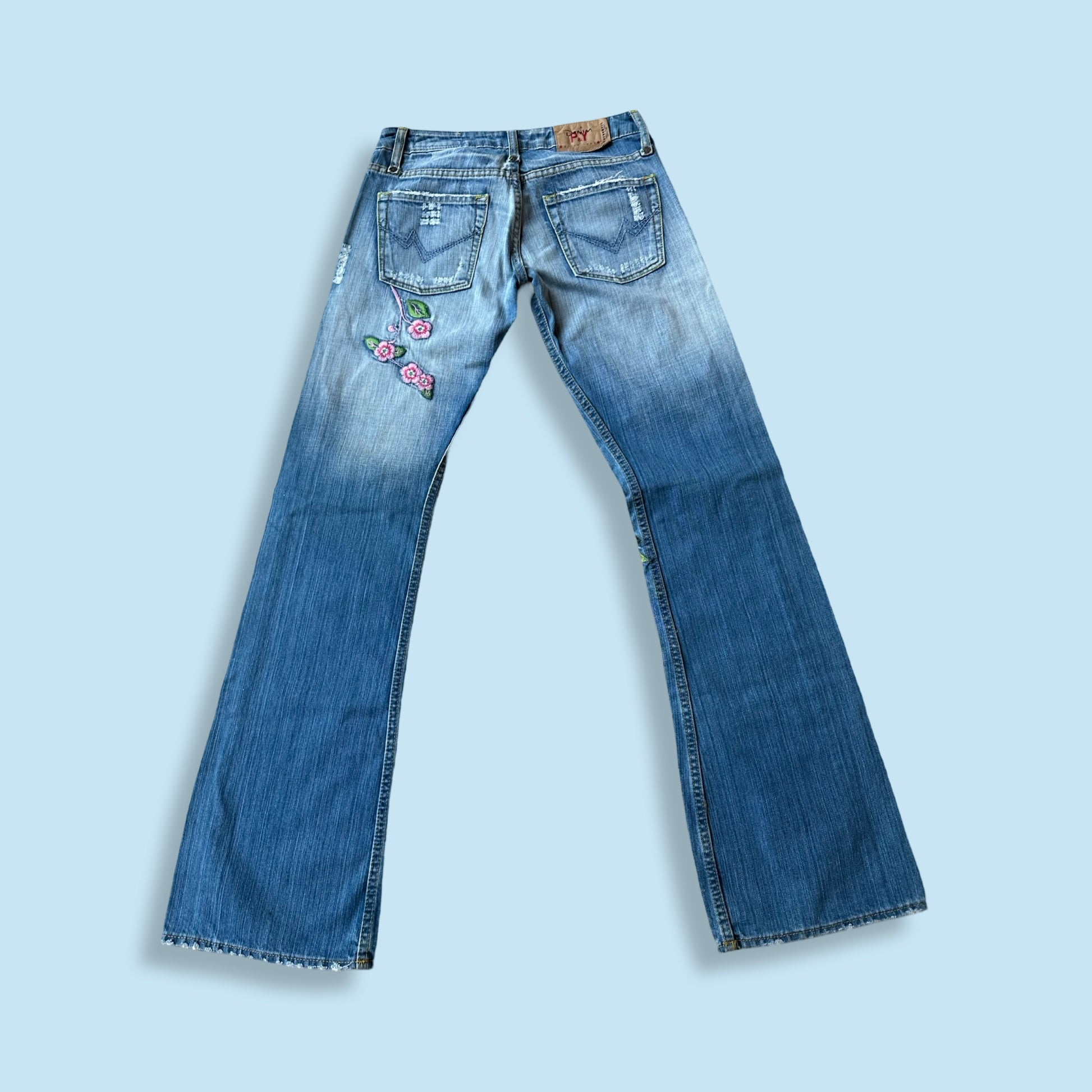 Alle bukser har lik passform, lav i livet med sleng. Kan sees på modell på Instagram. Det er ingen stretch i denimen, så dersom du er usikker på størrelse vil jeg anbefale å gå en opp. Mål vises på bilde nummer tre.
